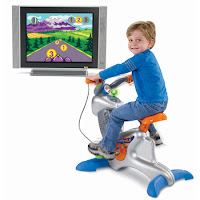 I first plugged the RCA connectors into my system selector, which stubbornly refused to accept the connection. I then decided to connect the bike directly to my television, which required that I take on the strange combined abilities of Indiana Jones and a Korean circus contortionist as I bent my body in impossible ways to slide past the Christmas tree and gain access to the forbidden temple of the TV’s rear input panel. It was touch and go there for awhile, but I eventually succeeded, although I also failed. Brittany switched on the bike and nothing happened. I tried a different input, and still there was nothing. Finally, as I was laboriously making my way out from behind the television, I heard a sharp slapping sound followed by the tinny bleeps and bloops of what sounded like an old Atari 2600 springing to live. Brittany had located the game cartridge that fits into the side of the bike, and perhaps inspired by her own genius, she slapped it into place. The bike immediately worked. I felt stupid for not having figured out about the cartridge myself, but my shame was quickly overcome by my joy of not having to bother with it any longer.