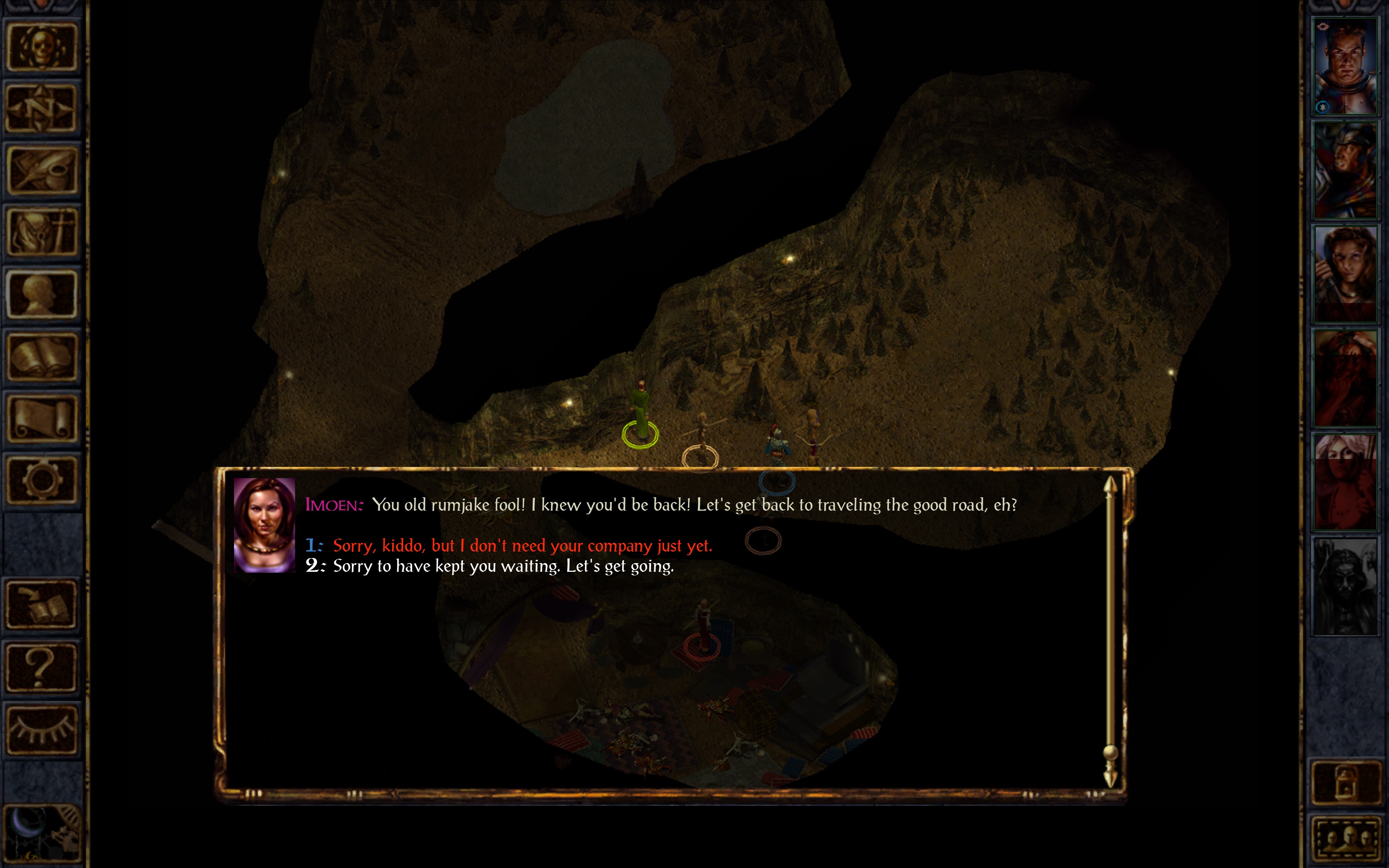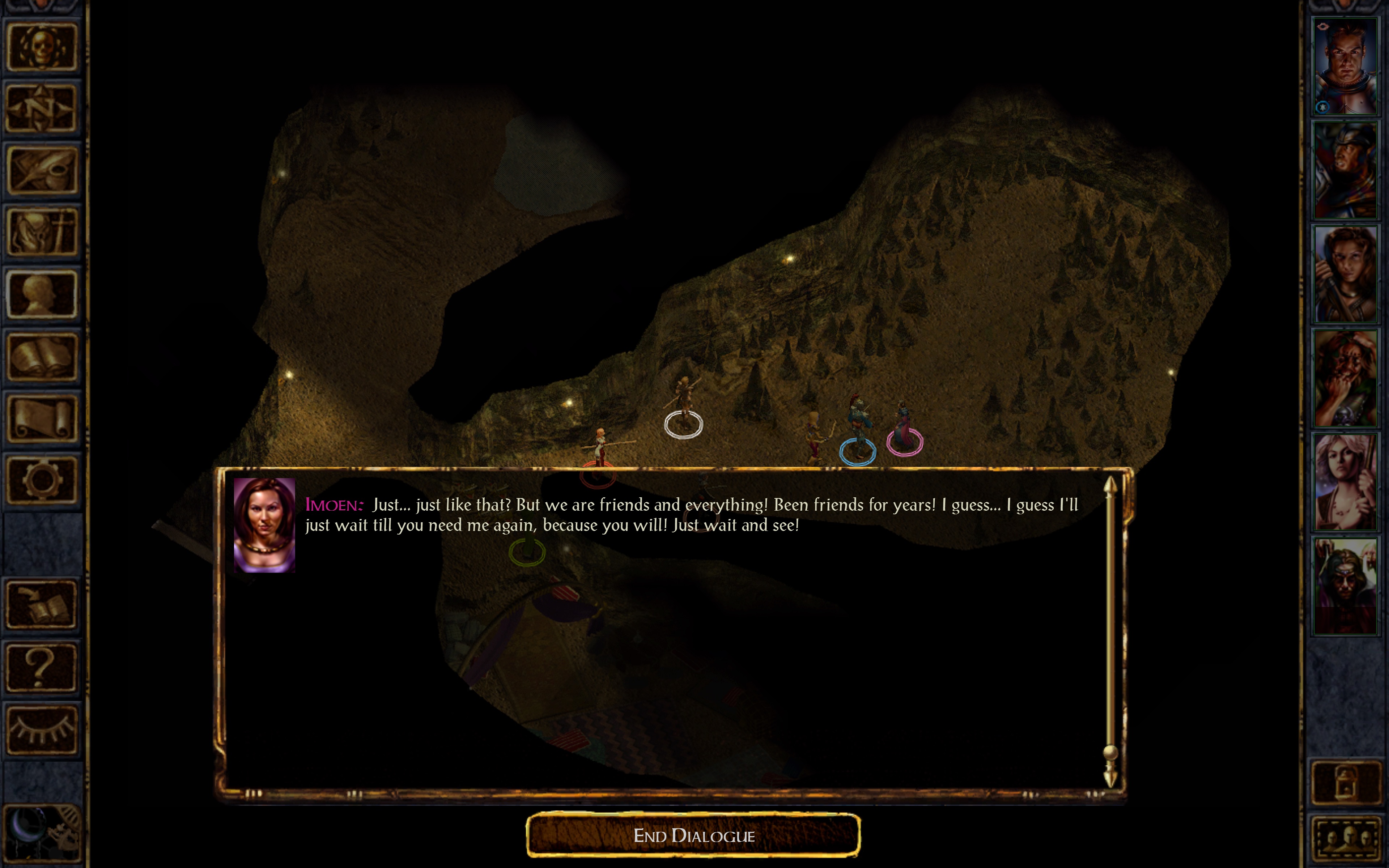 So I make with the round robin of inventory distribution until I’ve picked his bloated corpse clean, and we go back out the exit that supposedly was rendered impassable when we passed through it earlier, but which is now totally fine for whatever holy hell reason, and we leave. BUT NOT BEFORE PICKING UP IMOEN. AGAIN.