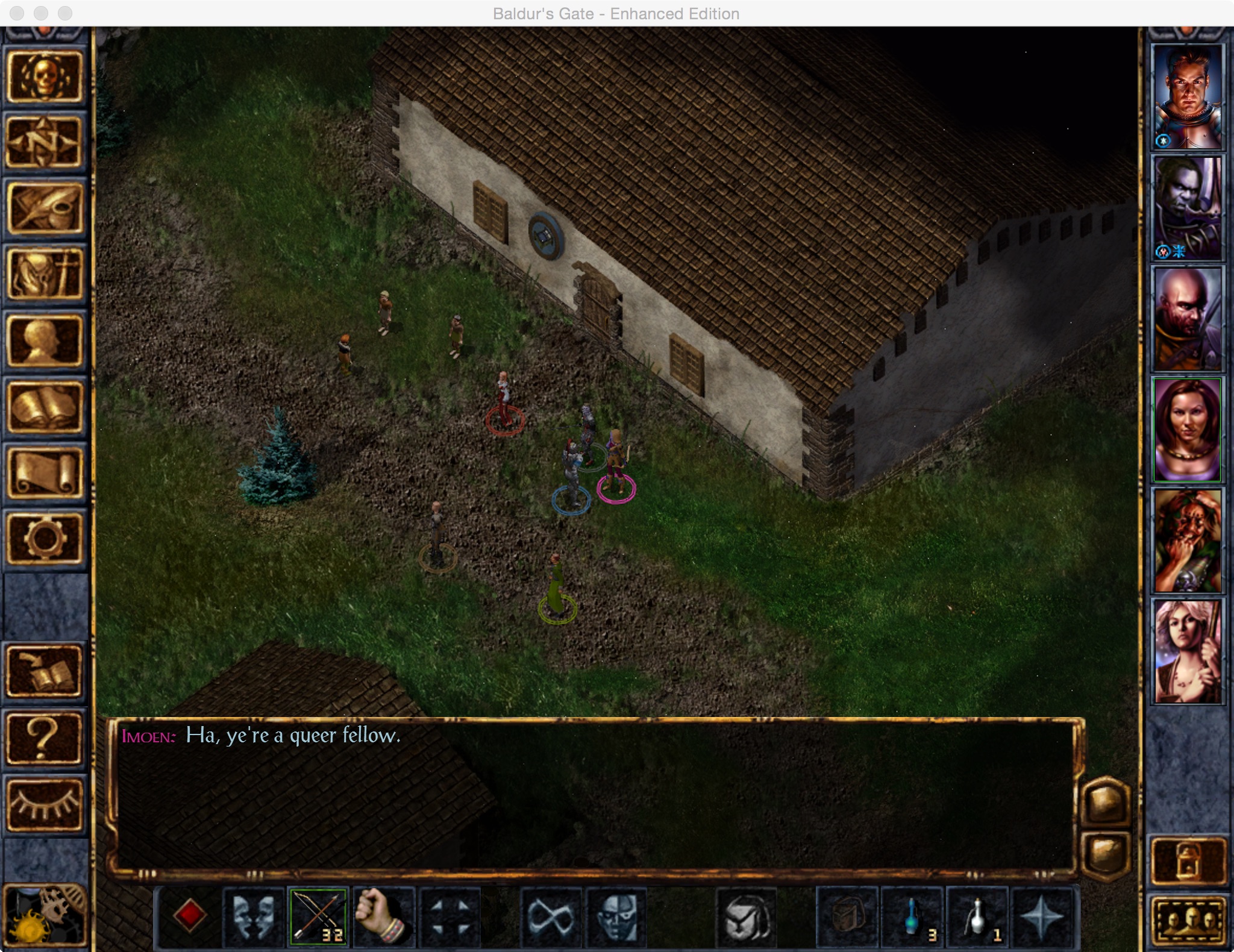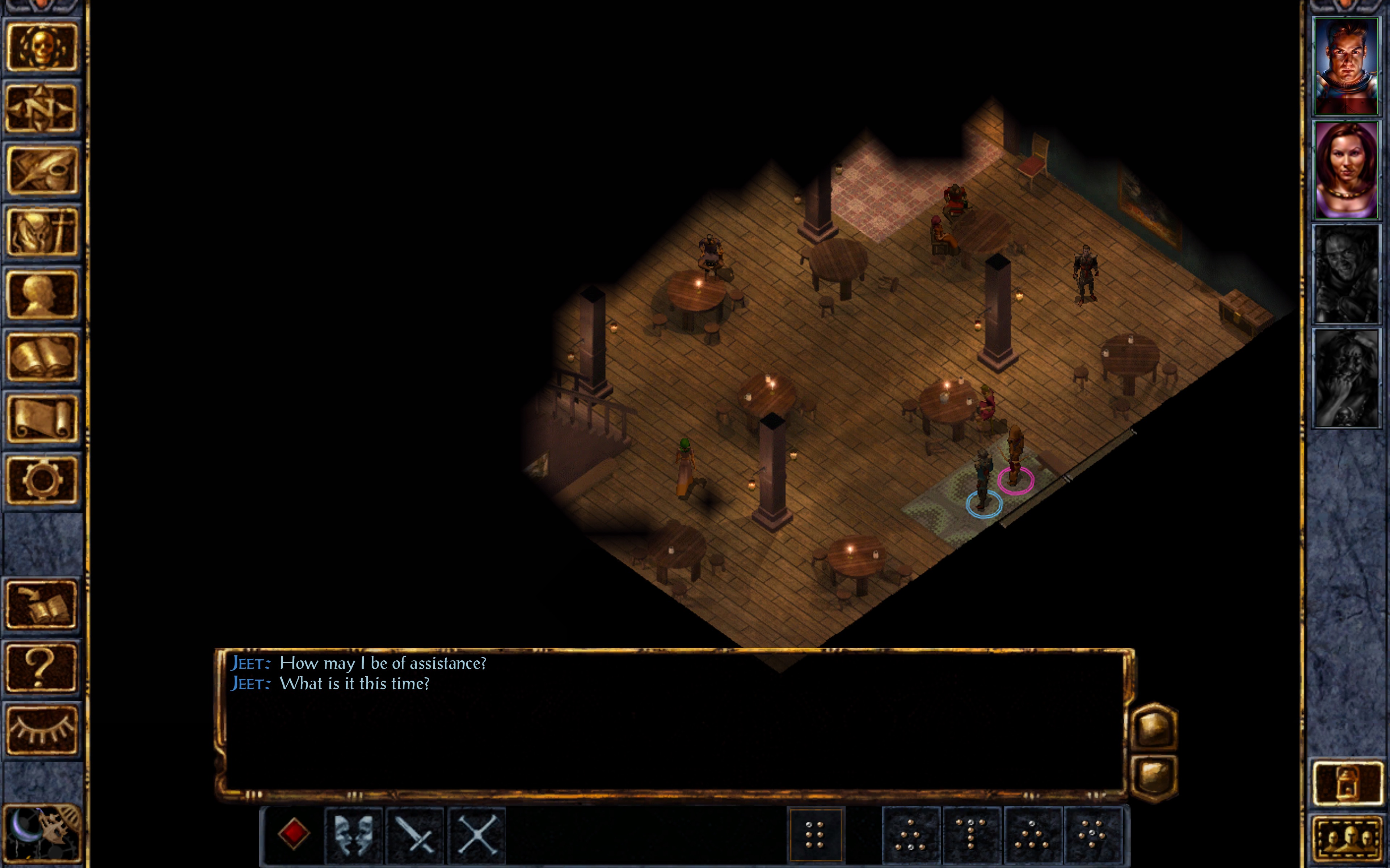 I find Imoen continuously walking back and forth between a very fat man and a very inanimate chair. Clearly, she was stymied by their lack of movement. Mother frakkin’ Imoen…
