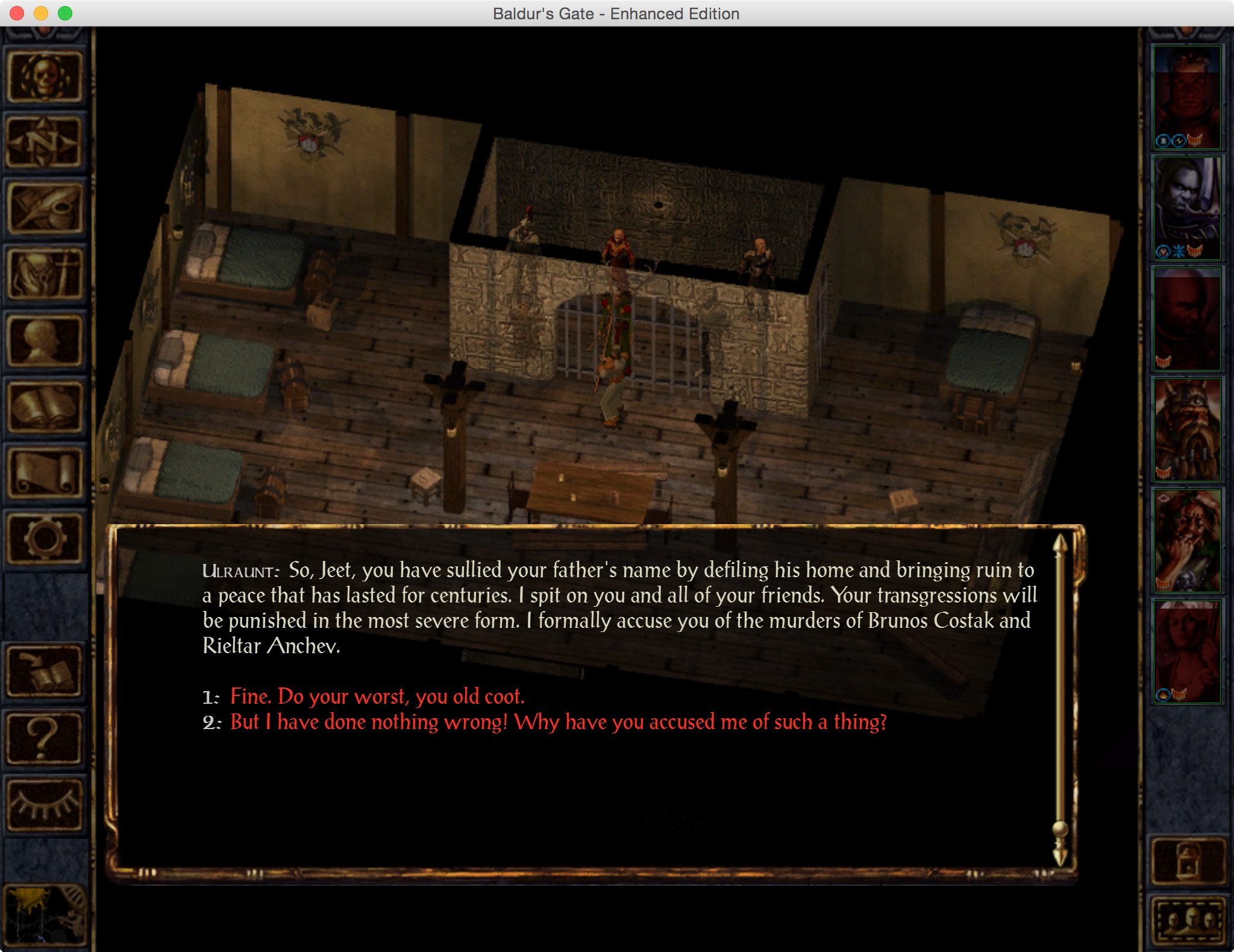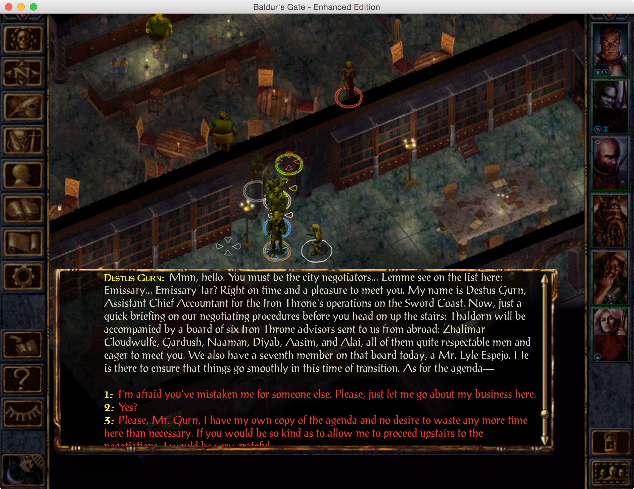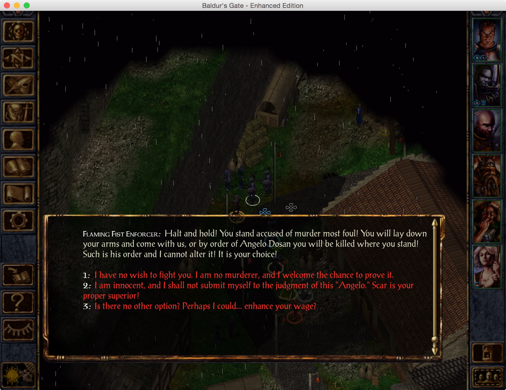 Wait. Sorry. I kind of blacked out for a second there. Anyway, Delthyr here represents those who harp, whatever that means and I don’t care. He tells me that Scar was assassinated, and Duke Ferdinand has come down with a mysterious illness and is probably about to die. He also says I’ve been accused of murder like I didn’t already know, and that Sarevok is the new Iron Throne president. Oh, and the Flaming Fist has a warrant out for my arrest, which explains all the fisters I’ve been murdering in the streets.
