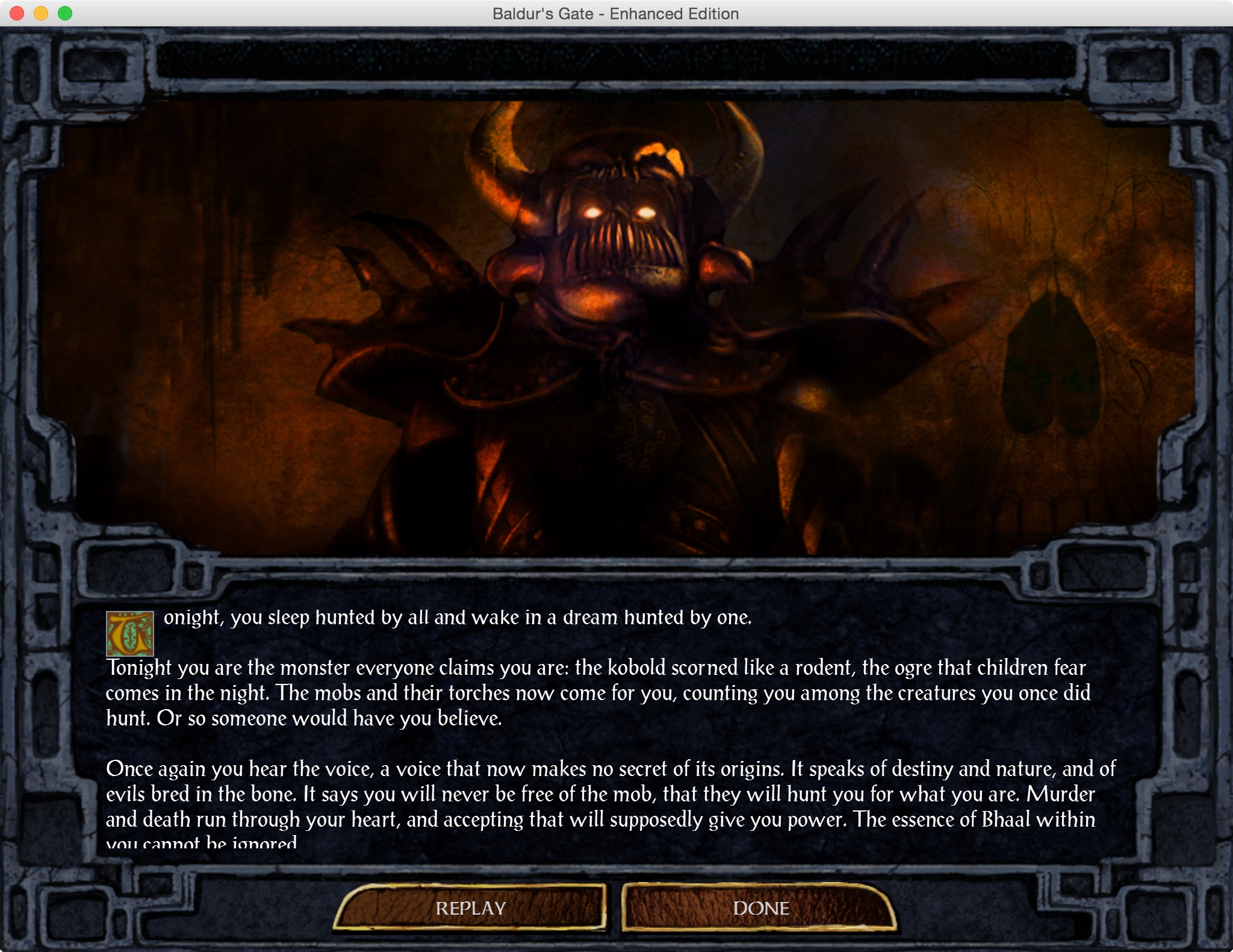 That’s when a giant, skull-faced baboon with horns shows up. It’s another one of these damn dream visions I keep getting that mostly consist of pretty bad narration and a wall of text. Apparently, the blood of someone called Bhaal runs through my veins and has something to do with my origins that I was either never told about, or wasn’t paying any attention when I was. It could go either way, really.