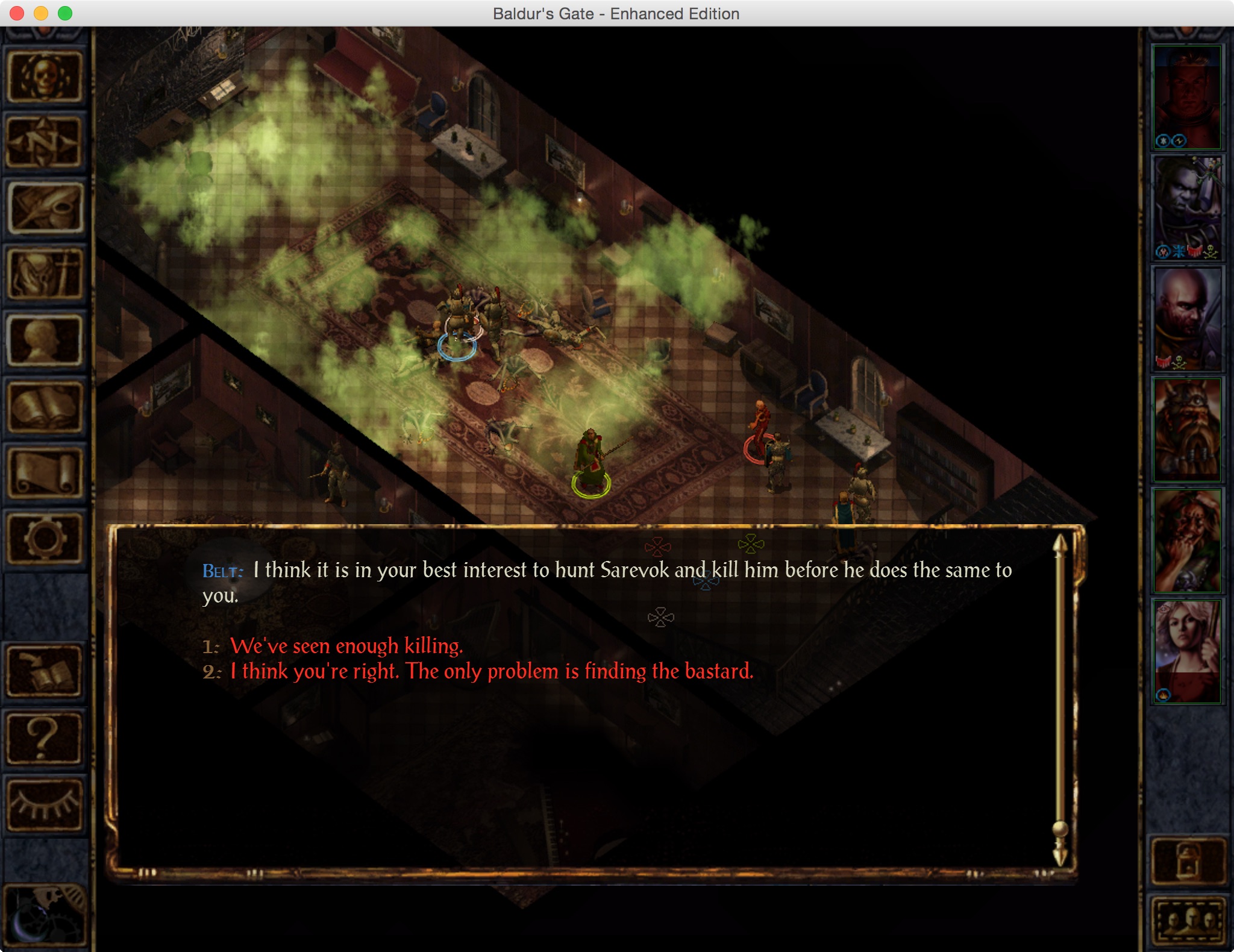 I eventually finish off the last one, then some guy named Belt thanks me for saving his life and he is eternally grateful and whatnot. This pisses Sarevok off something fierce, and he comes at me with his spiky horn helmet.