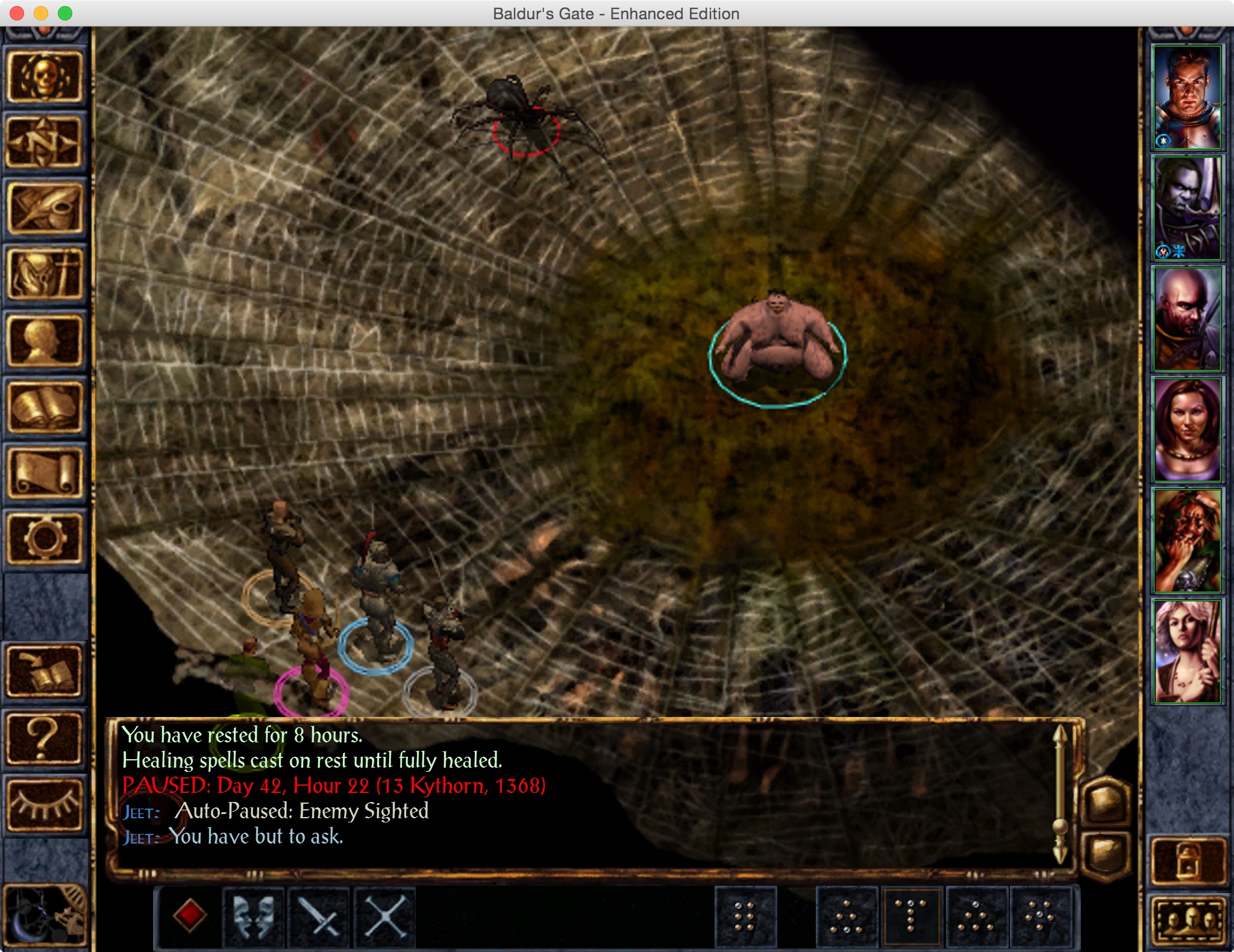We go back up to where Prat was, and start picking off his friends one by one, who are now scattered all around the caves. We murder some spiders while we’re hunting them down, but none of them – even the mages – have a protection from petrification spell, which I learned is a thing that exists because I CONSULTED THE MANUAL. Again.