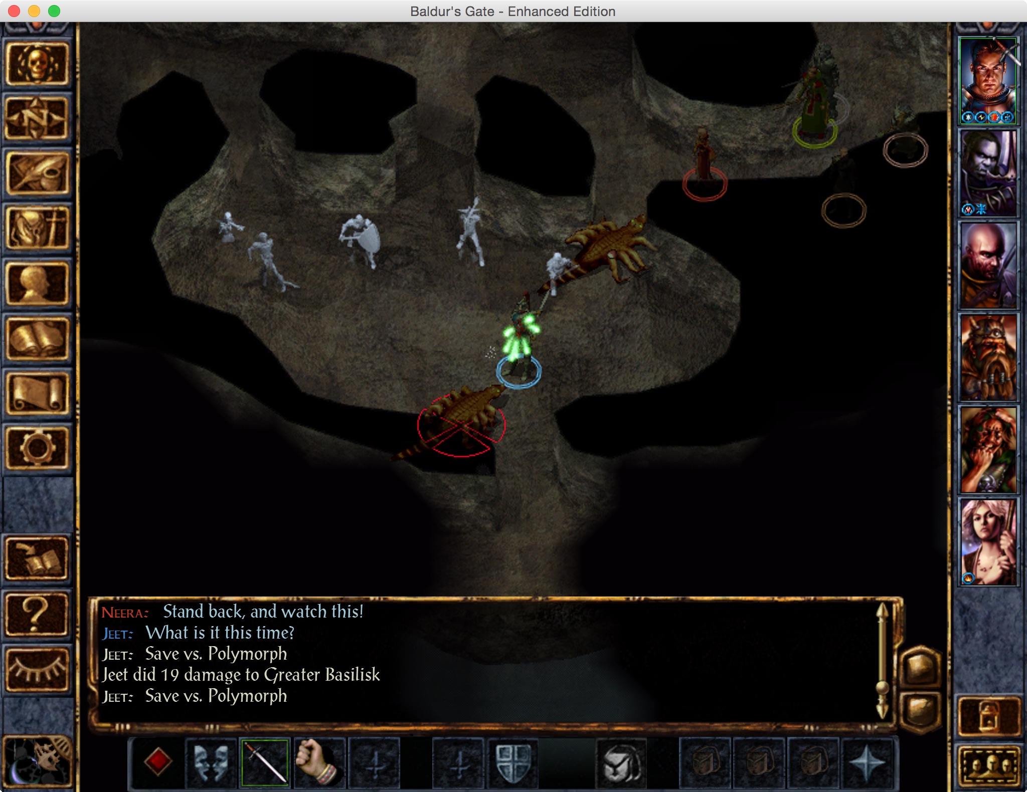 Within seconds, the spells start flying. Sarevok shouts at me, and a couple of his allies materialize in Ghostbusters slime and start flinging death balls at me. My mages fling death balls right back at them.