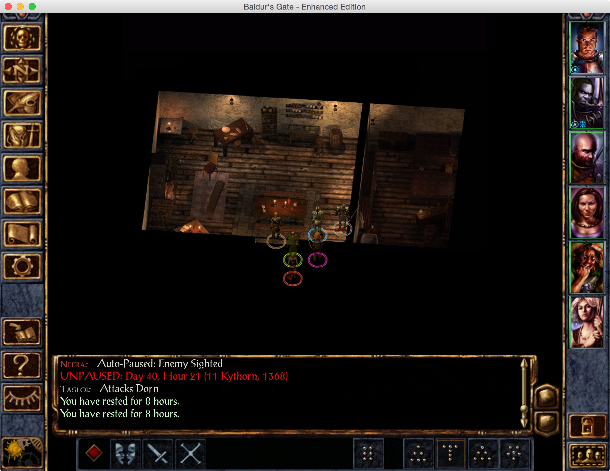 We pop up inside an Inn where the owners don’t think I’m an evil bastard, so I rent a room and let everyone get some rest so they’ll stop bitching at me about being exhausted. We awake refreshed and ready for more murder.