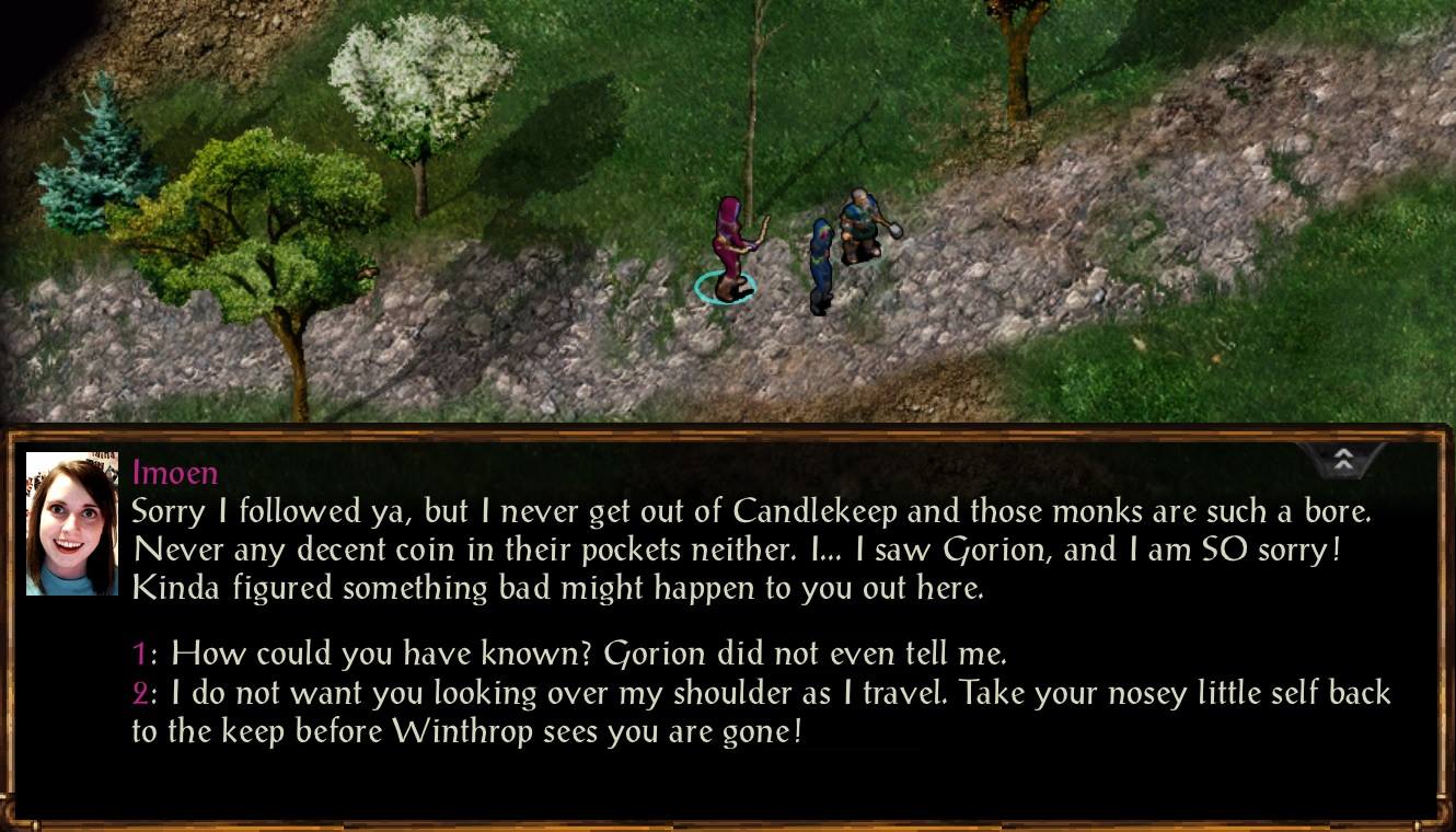 After that, you wake up the next morning and fuck me, if it isn’t Imoen coming merrily down the way, cheerfully proclaiming that you’re a queer fellow before acknowledging that, yeah, she knows the guy who raised you as his own child was just brutally exploded before your very eyes the night before. But hey, she really wanted to get out of Candlekeep and see the world, so heya! She’s coming with you, whether you like it or not.